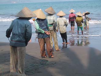 fishing from the shore. As the nets are set out on sea by boat rows of locals