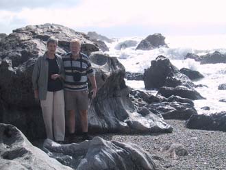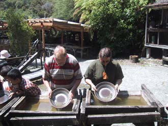 It was time to try our luck so we drove the next day to Shantytown, an old historic mining village. All buildings were restored as they were back in the 'Gold rush' days. It was nice wander around here. A lot of old stuff was displayed and Dad even found an old Lynotyp, were he worked on when he started working. So it was not exactly from the Gold rush times but who cares! Jeannette & Dad did some panning trying to find some gold. In a pan with stones you slowly wash the stones away with water and in the end there are only some gold flakes left. It looks easier then it is, especially when you like the stones as well as Jeannette did. But in the end they both found some gold but it didn't made them rich! So we continued further South along the coast. The road followed the coastline so most of the time we had nice views over the ocean. We stopped several times at nice beaches and had lunch at one of them.