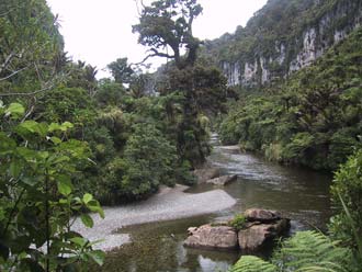 We needed a break (again) and as the campsite was quiet and right on the beach so we decided to stay some days longer. But that didn't meant we were lazy. We made a long hike through a gorge following a stream and we enjoyed the lush tropical vegetation. We had nice views on the stream and had the feeling we were walking deep in the jungle. We decided to walk back to the coast along another route. It started with a steep climb... and the track kept on climbing. We took it easy and finally we got over the top and had a easy stroll down. We almost got back to the coast when we suddenly had to cross a river. There was no bridge and the rapid flowing water made crossing looking difficult. Jeannette, Mum and I decided to follow the riverbed across its widest part as the water is here the shallowest. Nevertheless the water was flowing into our hiking boots but we made it safely through the river and only had to work our way through some bush to get back to the track. Dad had, as usual, a different approach: He opted for the 'straight-line' crossing. This was the shortest way but also the deepest way. But he would have got wet feet anyhow so he waded through and the water came up to his waist so he had to hold the video-camera above his head. But in the end we all reached the other side safely and we walked back to the main road along the coast. We followed it back to the campground passing the 'Pancake Rocks' again. We were exhausted and didn't do much else except hanging around the camper the rest of the day.