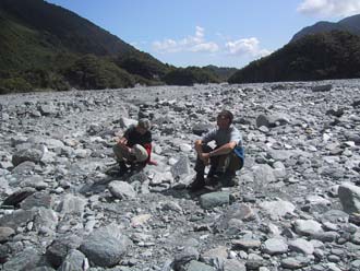 After a day driving we camped at a campground where we had nice views on the Franz Joseph glacier... that is when it's not clouded which it was. The campground appeared to be very noisy till late at night although I only heard about this the next morning from the others. In the morning it was still clouded but during the morning the sun broke slowly the clouds and we started to see the glacier. We drove to the glacier and walked the last bit over the stony glacier bed towards the end of the glacier. It was really impressive to see the end of the glacier and it was here nice cool despite the, meanwhile, hot burning sun. We spent here quite a while and after lunch at the camper Dad and I did some small tracks and found a small pool where there was a nice reflexion of the glacier in the water.